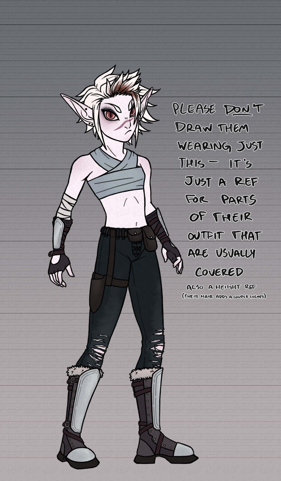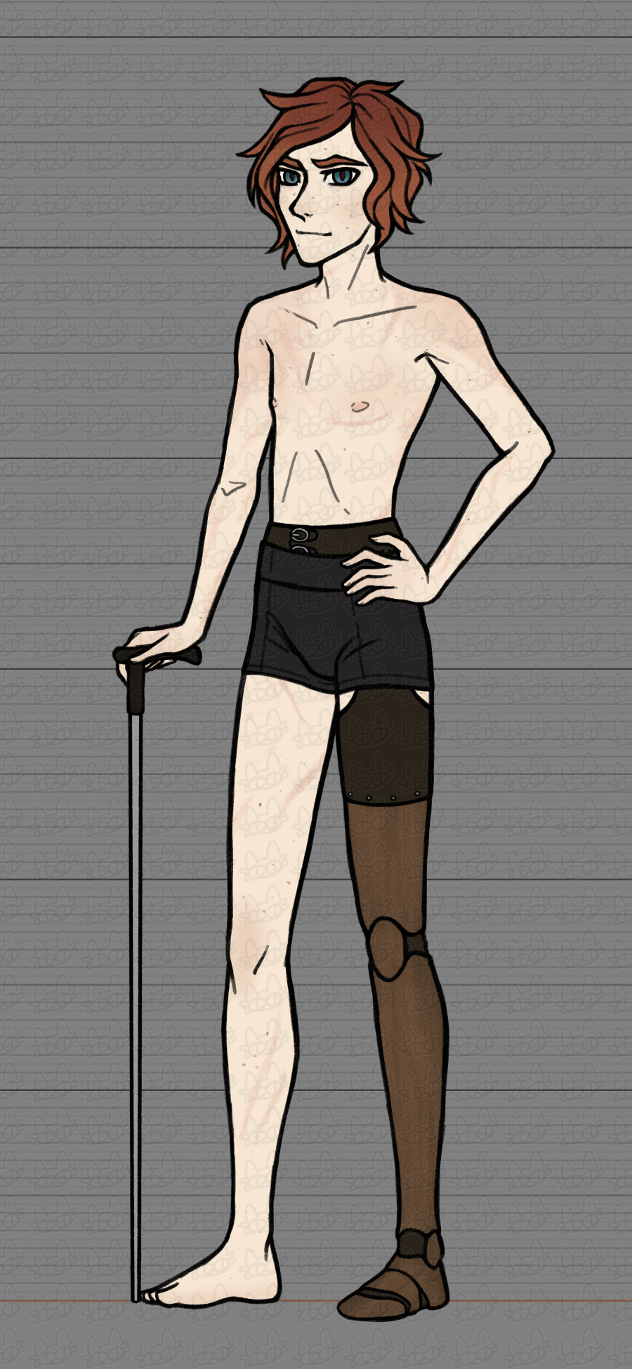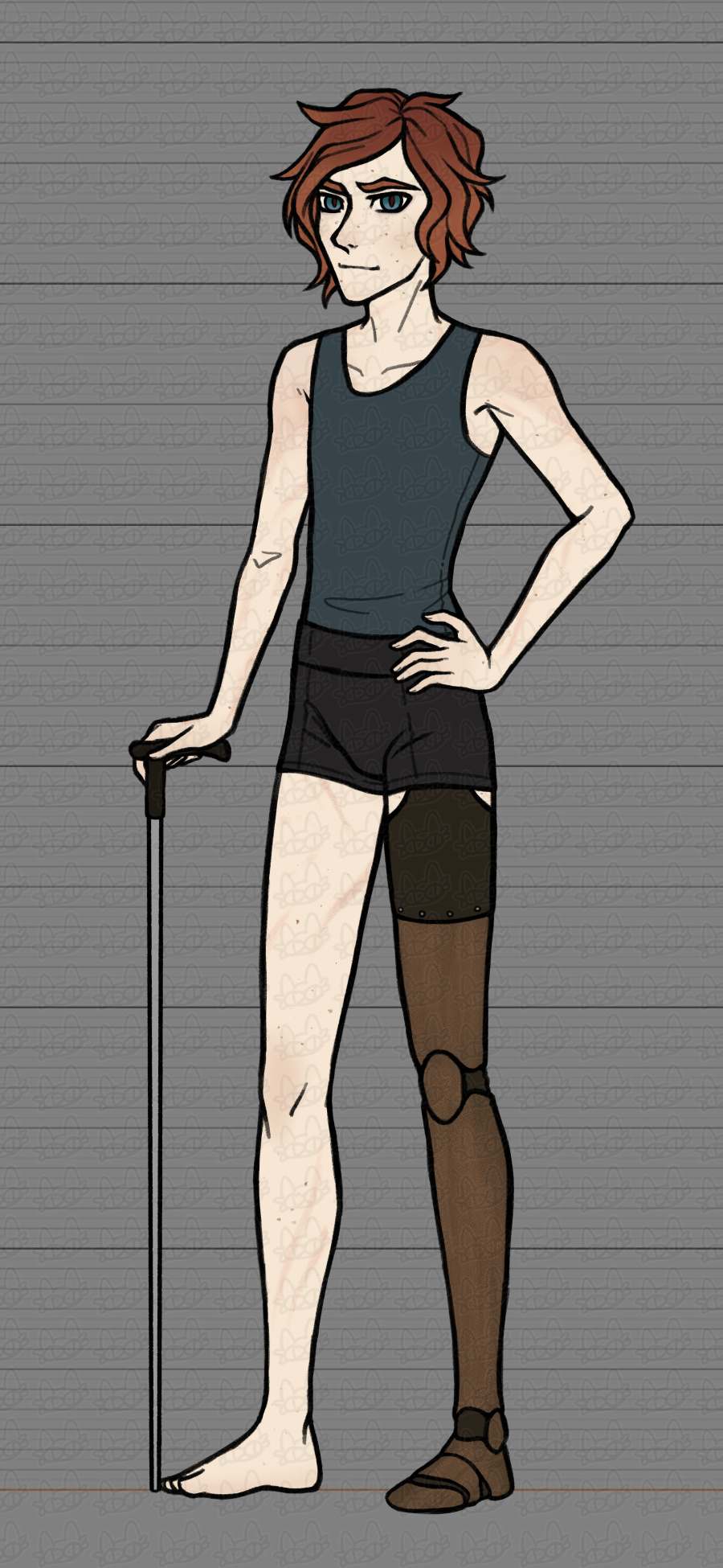 occupation: monster hunterhistory: the only known survivor of an attack on the village where he lived; suffered severe burns & lost his left leg from above the knee. also has extensive scarring from a werewolf attack years later, which would have been fatal (it was not a full moon), so he was injected with vampire blood to "save" him. claims to work as the night shift "groundskeeper" at the abandoned church he lives in (which is considered a historical site & is closed to visitors after sunset — but the rumors of a monster roaming the grounds keep luring people in). possibly gets a little too much enjoyment out of hunting.personality: generally very sociable, but difficult to befriend. vain & kind of a bitch. likes to tease. flirts for fun, but gets uncomfortable if someone retaliates with genuine interest. a bit twitchy. definitely doesnt get enough sleep. likes to tinker & make things (including his own prostheses). always has several projects in progress at any given time. very irritable if distracted while trying to work on something. prone to sudden bouts of depression.
