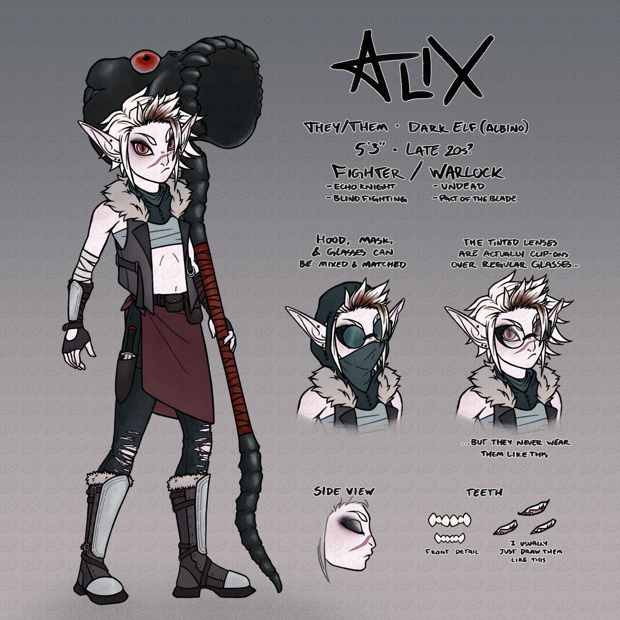 occupation: investgator of (primarily) paranormal/supernatural/occult affairshistory: had a twin brother who drowned when they were about ten. was blinded in their left eye from an infection rhey got the same day. ran away from home when they were a teen. was roped into a relationship with a woman in her 20s, whom they really only stayed with for the sake of stability. ditched her a few years later after meeting an exceptionally friendly bartender who turned out to be a vampire. he eventually turned them but they developed an illness that requires them to consume human flesh in addition to blood. later killed their ex girlfriend, then briefly returned to their childhood home to kill their father as well. spends a lot of time at sea; lives on their boat more than in their apartment.personality: curious & observant. very good at reading people. likes to know peoples secrets; doesnt usually care about their whole life story (but will pretend to to keep on good terms). a bit manipulative. will change how they act to try to appeal to whoever theyre talking to & will try to guide the conversation to get what they want out of it. can sometimes abruptly drop contact with someone if they no longer find them useful. avoids telling others much about themself. prefers not to draw attention — not unapproachable, just unassuming. has a lot of connections & seems to know something about everyone but has few close relationships. more interested in physical intimacy than emotional connection. has a bit of a temper. tends to either channel emotions like fear & sadness into anger or just bottle them up to avoid actually dealing with them. prone to breakdowns if things build up for too long.